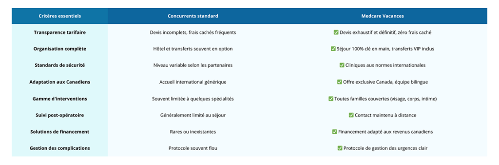 Contrairement à la concurrence qui propose des services génériques adaptés à tous les marchés internationaux, Medcare Vacances a développé une offre spécifiquement pensée pour les Canadiens, qu’ils soient francophones ou anglophones. Cette spécialisation se traduit par une compréhension fine de vos attentes, de votre culture médicale et de vos exigences en matière de qualité de service.