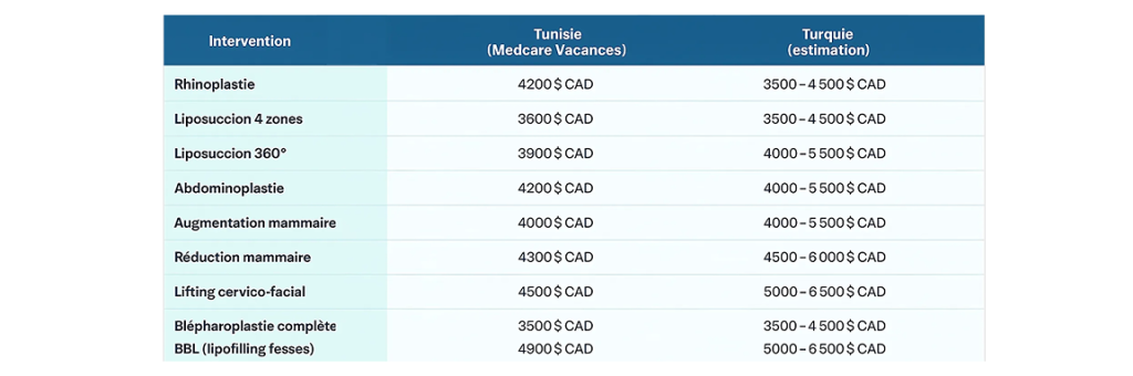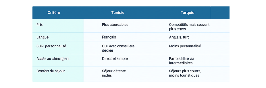 Voici un comparatif clair et pratique pour vous aider à mieux comprendre pourquoi la Tunisie pourrait être une option plus avantageuse que la Turquie pour votre projet esthétique.