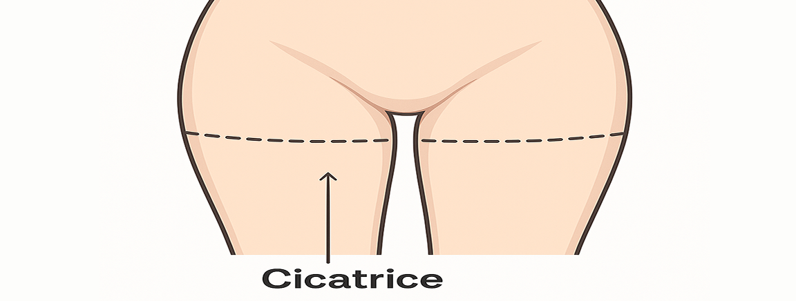 Ce type de cicatrice est résulté d’une technique qui est réservée au cas d’excès cutané modéré de la face interne des cuisses situés principalement à la partie haute de la cuisse.